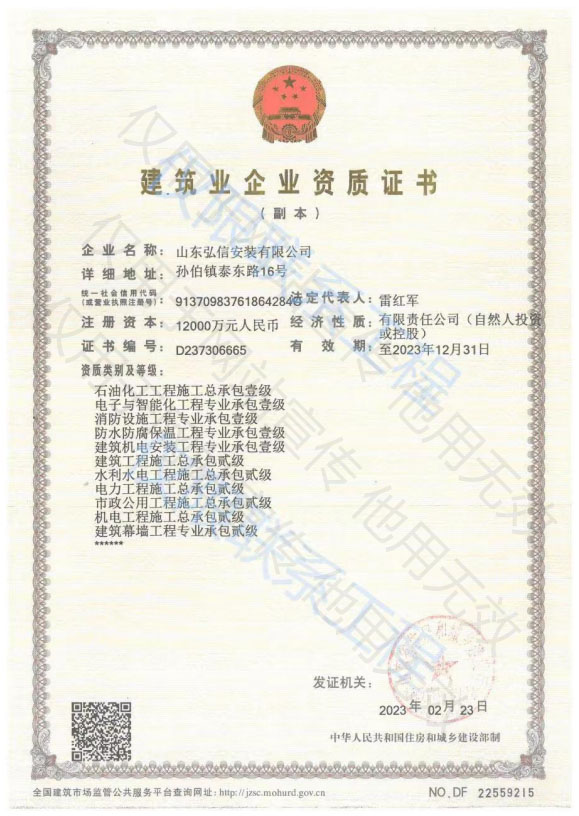 山东弘信安装工程有限公司(联系电话:18765383131)成立于2004年4月6日,公司注册地址:孙伯镇泰东路16号,注册资本:壹亿贰仟万元人民币,经济性质为自然人独资或控股